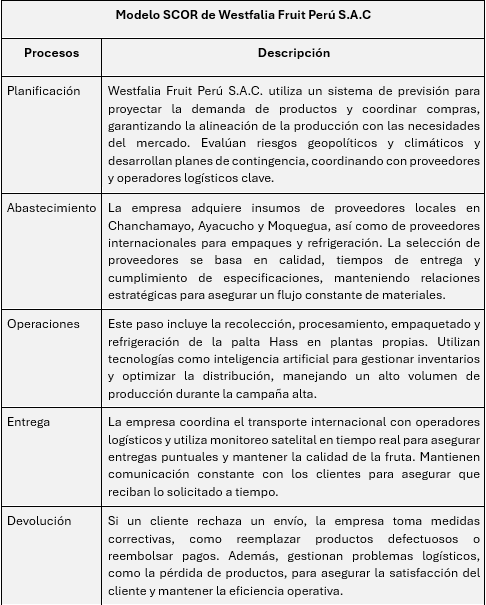 La planificación, abastecimiento, operaciones, entrega y devolución son componentes clave en la cadena de suministro de operaciones de Westfalia Fruit Perú S.A.C., una empresa que se dedica al cultivo, procesamiento y exportación de palta Hass. Cada uno de estos procesos juega un papel fundamental para garantizar que la empresa cumpla con sus compromisos de calidad, eficiencia y satisfacción del cliente.